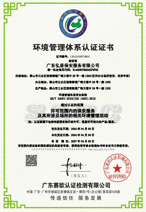 • 環境管理體系認證證書